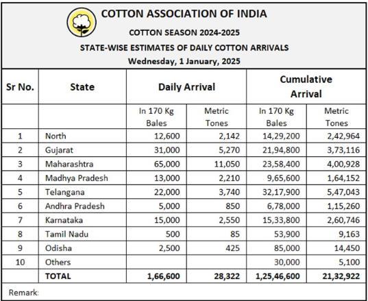 據(jù)外電1月1日消息,印度棉花協(xié)會(CAI)公布,2025年1月1日印度棉花到貨量預(yù)估為166600包(每包170公斤)或28322噸。
