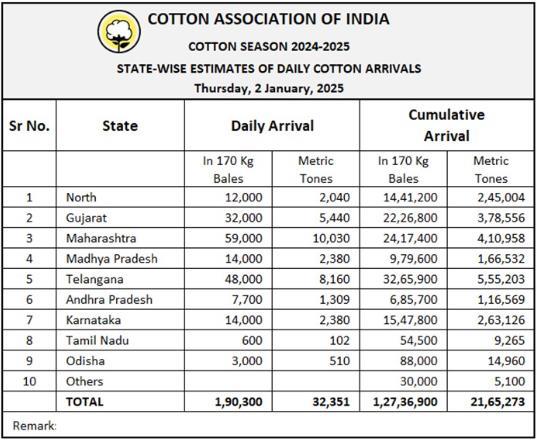 據(jù)外電1月2日消息,印度棉花協(xié)會(huì)(CAI)公布,2025年1月2日印度棉花到貨量預(yù)估為190300包(每包170公斤)或32351噸。