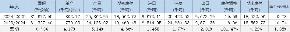 2024/25年度全球棉花期末庫存預(yù)估為1852.21萬噸(上月預(yù)估為1847.03萬噸),同比減少0.22%,2023/24年度期末庫存預(yù)估為1856.27萬噸。
