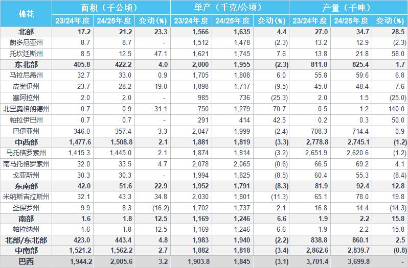 2024/25年度巴西棉花單產(chǎn)預(yù)估為1845千克/公頃,同比減少3.1%,2023/24年度為1904千克/公頃。