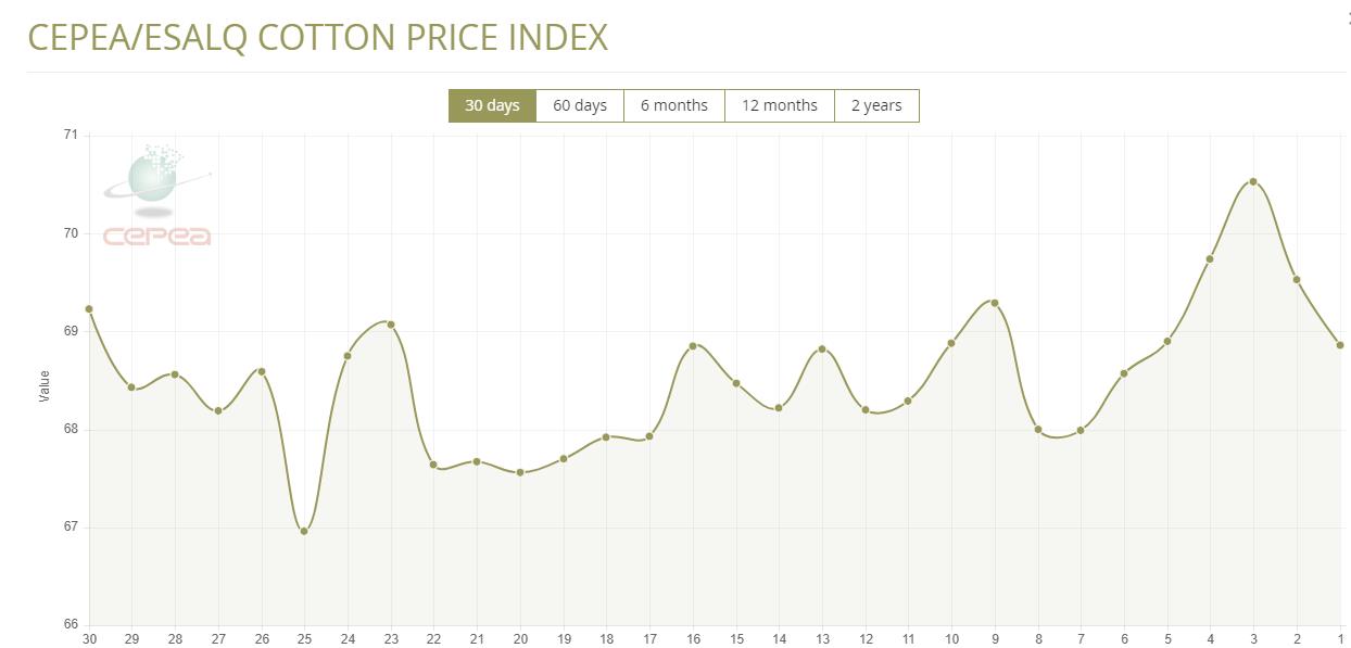 據(jù)外電1月27日消息,1月27日巴西CEPEA/ESALQ棉花價(jià)格指數(shù)報(bào)68.86美分/磅,較前一交易日下跌0.96%。