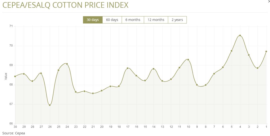 據(jù)外電1月28日消息,1月28日,巴西CEPEA/ESALQ棉花價(jià)格指數(shù)報(bào)69.71美分/磅,較前一交易日上漲1.23%。