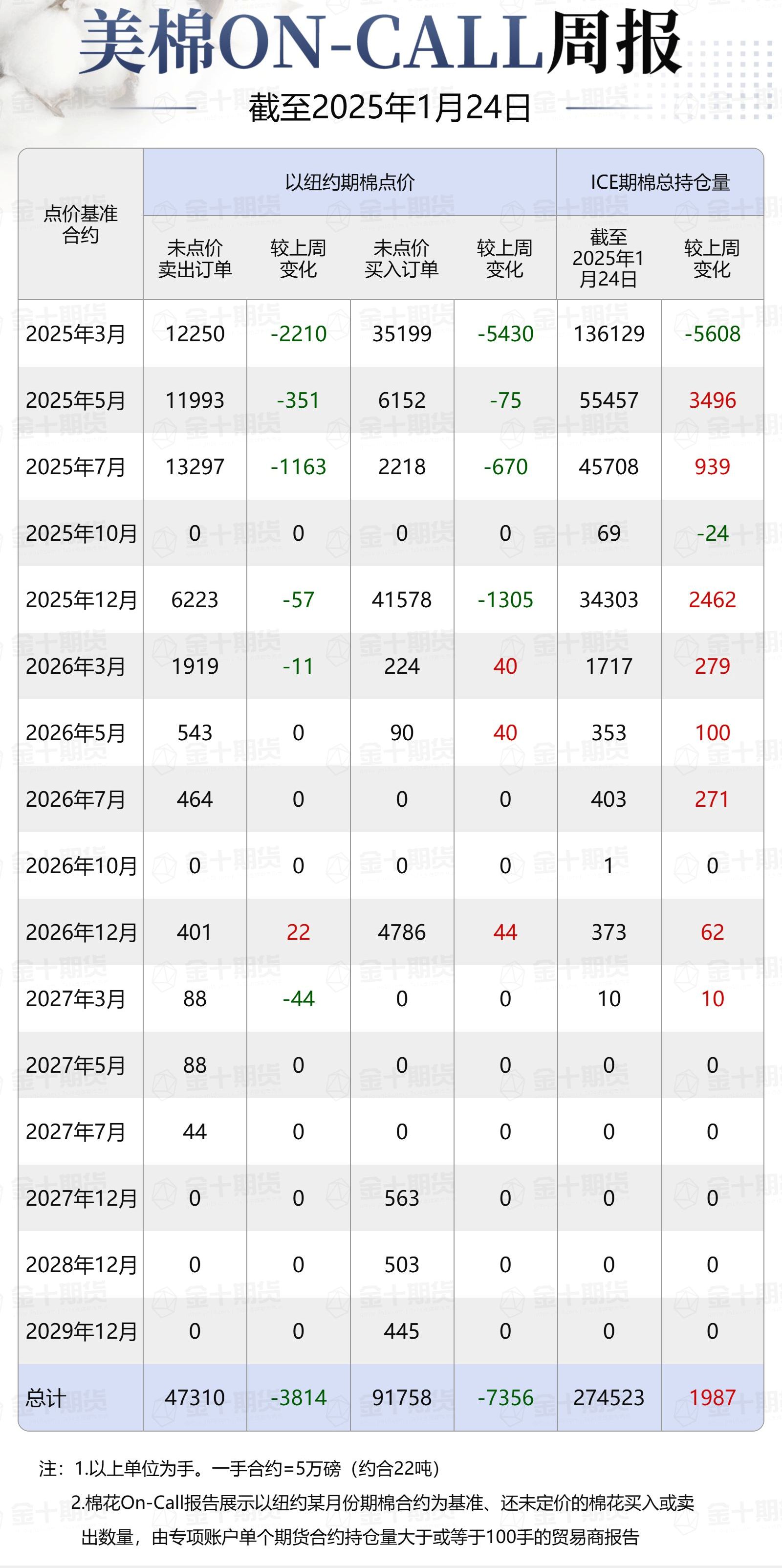 據(jù)美國(guó)商品期貨交易委員會(huì)(CFTC)最新數(shù)據(jù),截至1月24日,①美棉On-Call未點(diǎn)價(jià)賣出訂單47310手,環(huán)比減少3814手;未點(diǎn)價(jià)買入訂單91758手,環(huán)比減少7356手;②ICE期棉2503合約上賣方未點(diǎn)價(jià)合約為12250手,環(huán)比減少2210手;③ICE期棉2505合約上賣方未點(diǎn)價(jià)合約為11993手,環(huán)比減少351手;④ICE期棉2507合約上賣方未點(diǎn)價(jià)合約為13297手,環(huán)比減少1163手;⑤ICE棉花期貨盤(pán)面2024/25年度(8月至次年7月)的On-Call合約未點(diǎn)價(jià)賣出訂單為37540手,環(huán)比減少3724手。