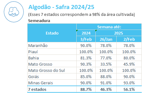 據(jù)巴西農(nóng)業(yè)部下屬的國家商品供應(yīng)公司CONAB,截至2月2日,巴西棉花播種率為56.1%,上周為46.3%,去年同期為88.7%。