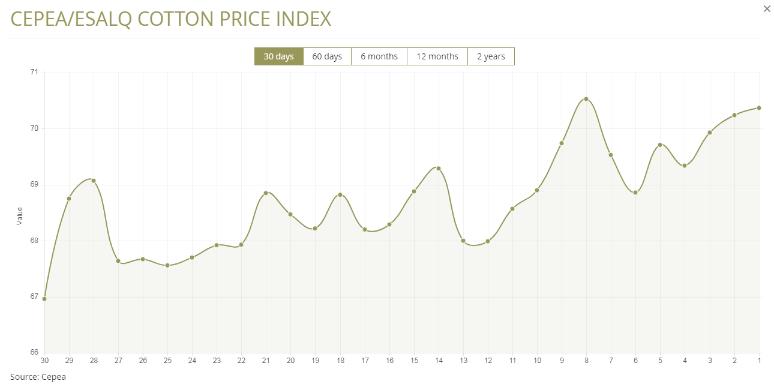 據(jù)外電2月3日消息,1月31日巴西CEPEA/ESALQ棉花價格指數(shù)報70.37美分/磅,較前一交易日上漲0.19%。