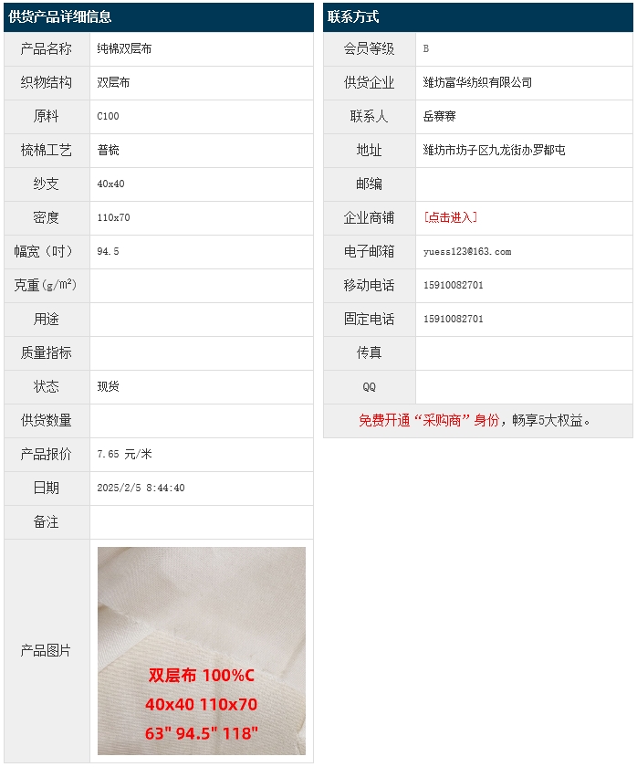 2月5日,濰坊富華紡織有限公司純棉雙層布C100 40x40 110x70 94.5",報(bào)價(jià)為7.65元/米,實(shí)際成交價(jià)以協(xié)商為準(zhǔn)。[點(diǎn)擊查看詳情]