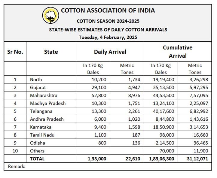 據(jù)外電2月4日消息,印度棉花協(xié)會(huì)(CAI)公布,2025年2月4日印度棉花到貨量預(yù)估為133000包(每包170公斤)或22610噸。