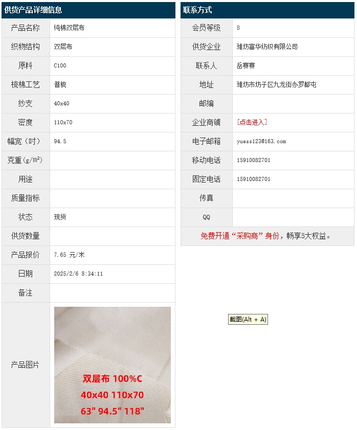 2月6日,濰坊富華紡織有限公司純棉雙層布C100 40x40 110x70 94.5",報價為7.65元/米,實際成交價以協(xié)商為準(zhǔn)。[點擊查看詳情]