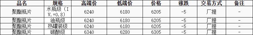 華東聚酯瓶片價(jià)格下跌5元至6205元/噸,原油拖累原料繼續(xù)下行,聚酯瓶片工廠暫未出價(jià),局部大廠基差03合約貼水5元/噸。市場(chǎng)重心偏弱調(diào)整,2-3月貨源報(bào)盤03合約貼水10元/噸、升水30元/噸或6180-6240元/噸,遞盤6170-6180元/噸或03合約貼水30元/噸。