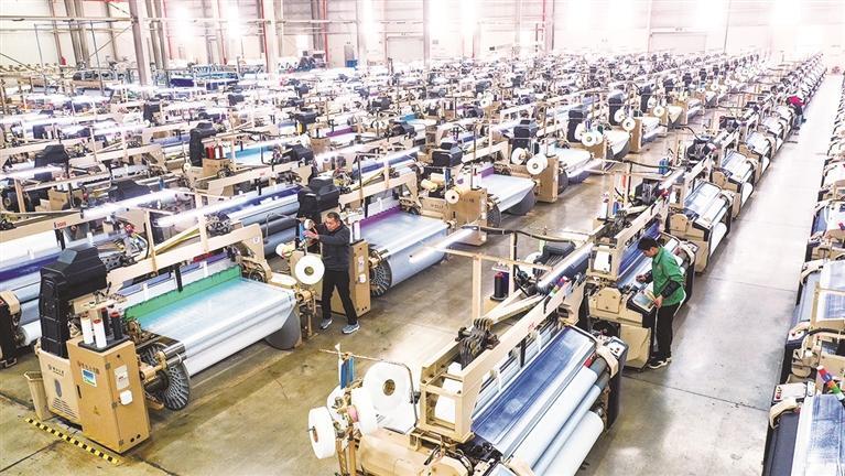 百川彩紡科技有限公司織造車間內(nèi),幾百臺織機同時開工生產(chǎn)。