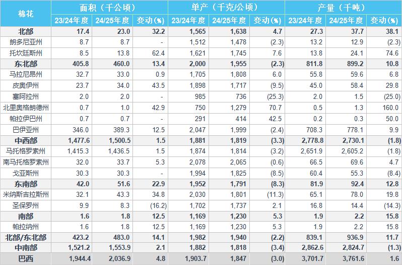 2024/25年度巴西棉花種植面積預(yù)估為203.69萬公頃,同比增加4.8%,2023/24年度為194.44萬公頃。
