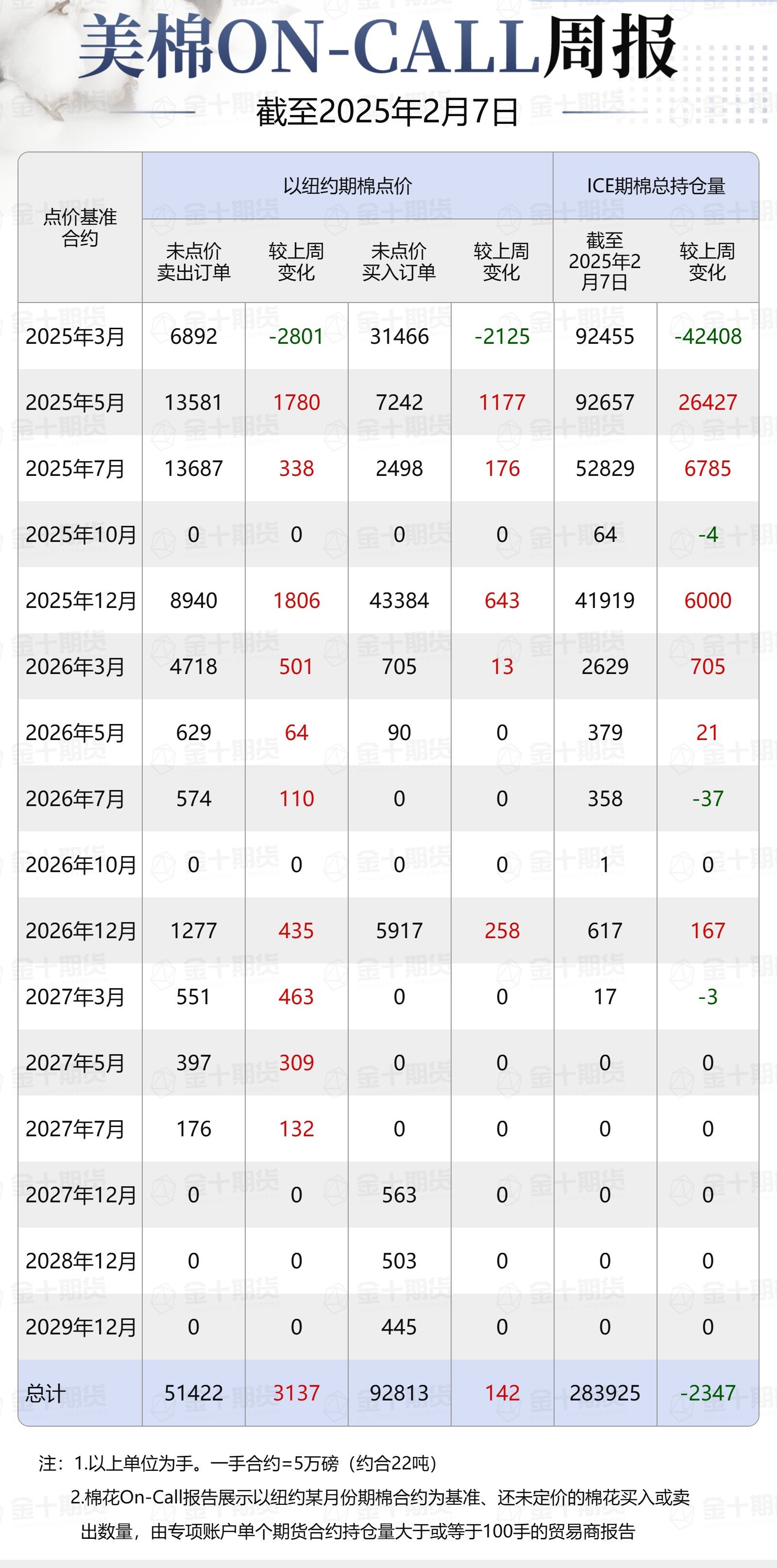 據(jù)美國商品期貨交易委員會(CFTC)最新數(shù)據(jù),截至2月7日,①美棉On-Call未點(diǎn)價(jià)賣出訂單51422手,環(huán)比增加3137手;未點(diǎn)價(jià)買入訂單92813手,環(huán)比增加142手;②ICE期棉2503合約上賣方未點(diǎn)價(jià)合約為6892手,環(huán)比減少2801手;③ICE期棉2505合約上賣方未點(diǎn)價(jià)合約為13581手,環(huán)比增加1780手;④ICE期棉2507合約上賣方未點(diǎn)價(jià)合約為13687手,環(huán)比增加338手;⑤ICE棉花期貨盤面2024/25年度(8月至次年7月)的On-Call合約未點(diǎn)價(jià)賣出訂單為34160手,環(huán)比減少683手。