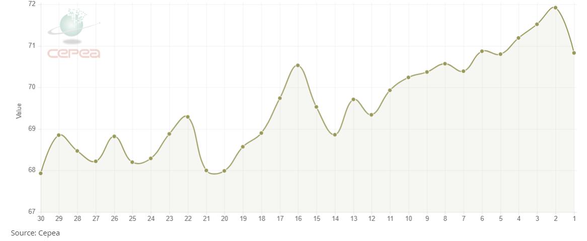 據(jù)外電2月13日消息,2月13日巴西CEPEA/ESALQ棉花價(jià)格指數(shù)報(bào)70.83美分/磅,較前一交易日下跌1.52%。
