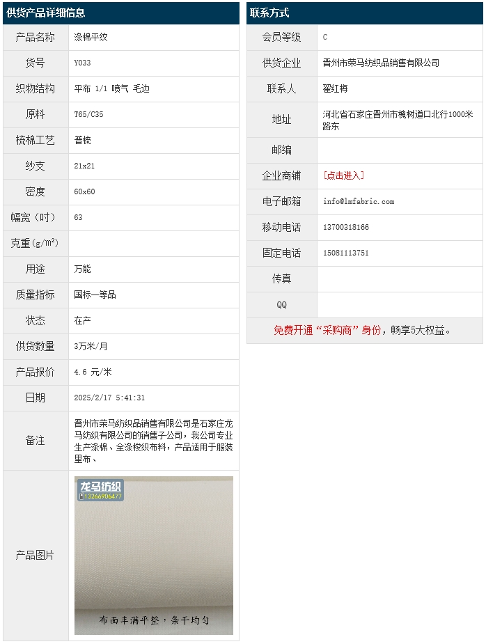 2月15日,晉州榮馬紡織品銷售有限公司滌棉平紋T65/C35 21x21 60x60 63" 平布 1/1 噴氣 毛邊,報(bào)價(jià)為4.6元/米,實(shí)際成交價(jià)以協(xié)商為準(zhǔn)。[點(diǎn)擊查看詳情]