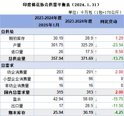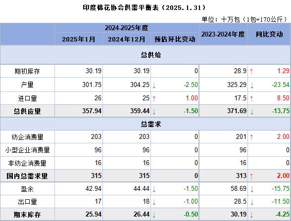 產(chǎn)量下降提升棉價(jià)看漲情緒。印度國內(nèi)消費(fèi)量預(yù)計(jì)為3150萬包,出口量預(yù)計(jì)將從上年度的283.6萬包降至170萬包,供應(yīng)限制可能會(huì)使價(jià)格居高不下。截至2025年1月31日,棉花總供應(yīng)量估計(jì)為2342.6萬包,其中包括1880.7萬包的新軋棉、160萬包進(jìn)口棉、301.9萬包的期初庫存。