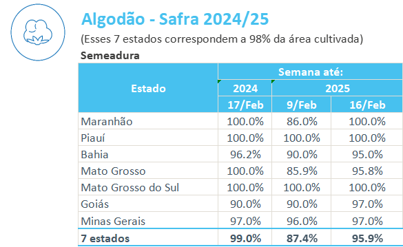 據(jù)巴西農(nóng)業(yè)部下屬的國家商品供應(yīng)公司CONAB,截至2月16日,巴西棉花播種率為95.9%,上周為87.4%,去年同期為99.0%。
