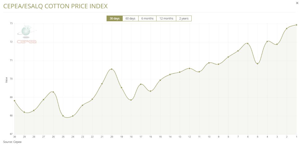 據(jù)外電2月19日消息,2月19日巴西CEPEA/ESALQ棉花價格指數(shù)報每磅72.93美分,較前一交易日上漲0.27%。