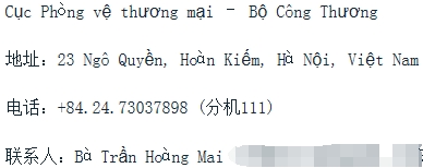 調(diào)查機(jī)關(guān)(越南工貿(mào)部貿(mào)易防衛(wèi)局)聯(lián)系方式: