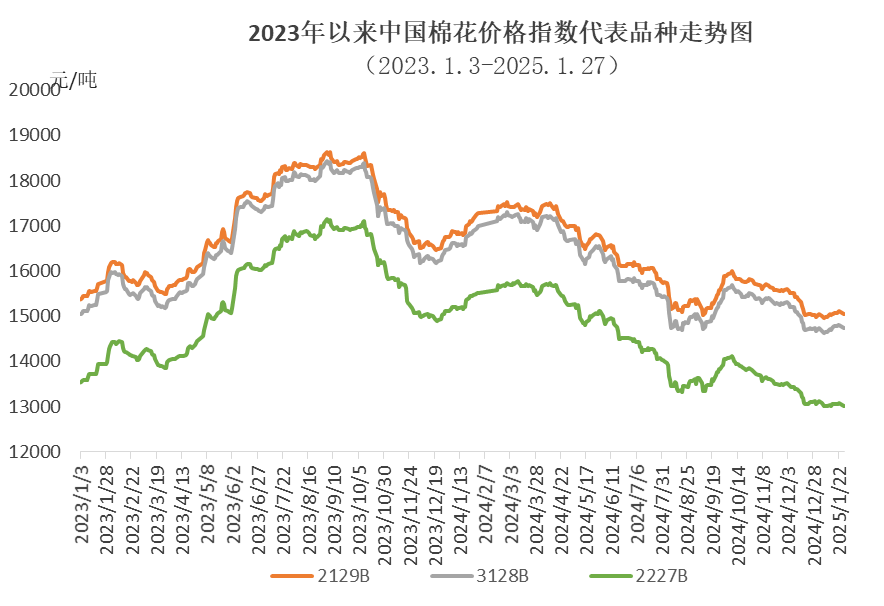 1月,新棉加工量持續(xù)增加,市場供應(yīng)寬松,月初國內(nèi)棉價延續(xù)前期下跌趨勢,中國棉花價格指數(shù)(CCIndex3128B)最低跌至14630元/噸。隨后,央行等部門釋放積極政策信號,提振市場情緒,棉價逐漸反彈至14814元/噸。月末,受春節(jié)假期影響,購銷市場基本停滯,棉價略有回落。1月中國棉花價格指數(shù)(CCIndex3128B)月均價14721元/噸,環(huán)比下跌228元,同比下跌1969元。
