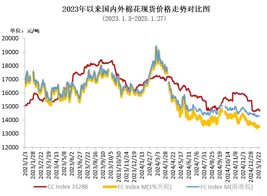 2025年1月,國內(nèi)棉花市場呈現(xiàn)先跌后漲的走勢。月初,新棉供應(yīng)持續(xù)增加,現(xiàn)貨價格小幅回落;中旬,隨著宏觀政策預(yù)期轉(zhuǎn)暖,棉紡織廠對后市持樂觀態(tài)度,適度補(bǔ)充原料庫存,推動棉價上漲;下旬,受春節(jié)假期影響,紡織廠陸續(xù)放假,市場成交轉(zhuǎn)淡,棉價略有回落。同期,受美元指數(shù)沖高回落、USDA報告上調(diào)全球產(chǎn)量等因素影響,國際棉價震蕩下跌,內(nèi)外棉價差隨之波動。