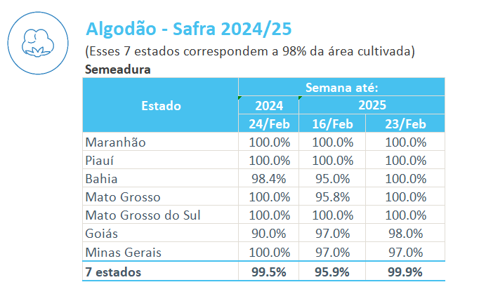 據(jù)巴西農(nóng)業(yè)部下屬的國(guó)家商品供應(yīng)公司CONAB,截至2月23日,巴西棉花播種率為99.9%,上周為95.9%,去年同期為99.5%。