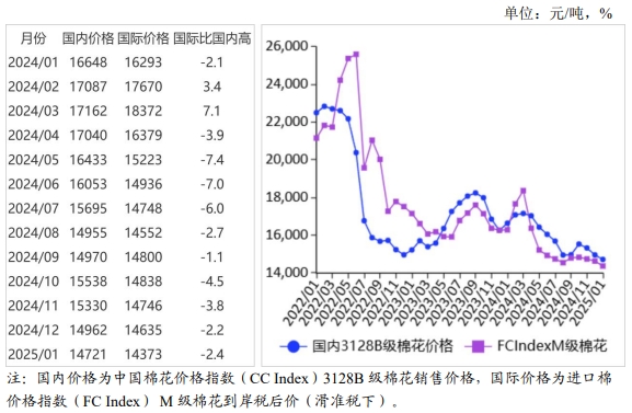 (二)國(guó)際棉價(jià)下跌。美國(guó)農(nóng)業(yè)部調(diào)增2024/25年度全球棉花產(chǎn)量預(yù)期,國(guó)際棉價(jià)承壓運(yùn)行。1月CotlookA指數(shù)(相當(dāng)于國(guó)內(nèi)3128B級(jí)棉花)月均價(jià)每磅78.26美分,環(huán)比跌2.2%,同比跌14.9%。