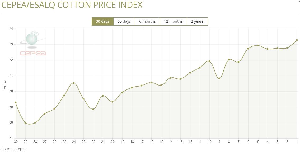 據(jù)外電2月25日消息,2月25日巴西CEPEA/ESALQ棉花價格指數(shù)報73.28美分/磅,較前一交易日上漲0.69%。