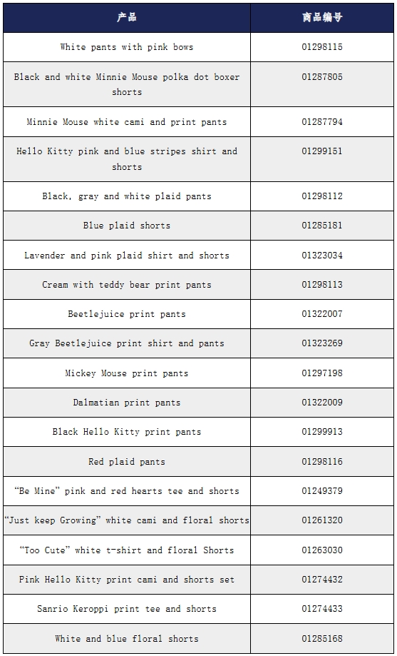 此次召回產(chǎn)品為Forever 21的20款兒童睡衣。產(chǎn)品尺寸為5/6、7/8、9/10、11/12、13/14,款式編號為01263030,UPC為0126303。具體召回產(chǎn)品信息如下:
