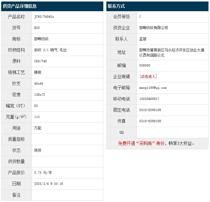 3月4日,邯鄲紡織有限公司滌棉斜紋布JCVC60/40 45x45 136x72 63" 2/1 115g/㎡ 噴氣 毛邊,報價為5.75元/米,實際成交價以協(xié)商為準(zhǔn)。[點擊查看詳情]