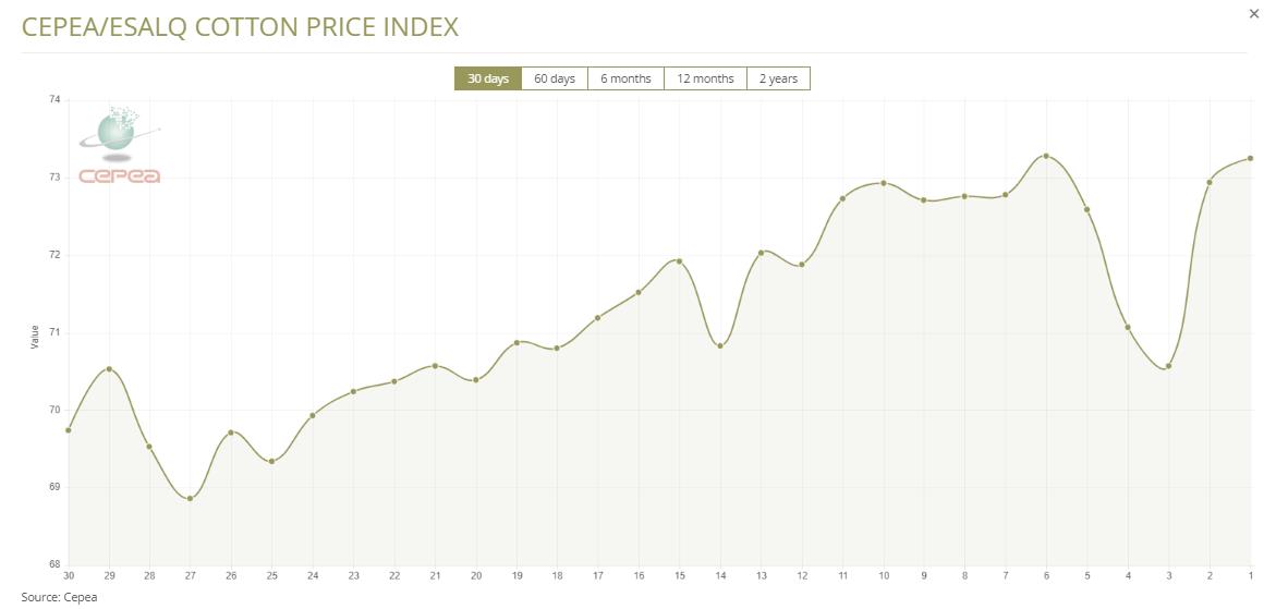 3月6日巴西CEPEA/ESALQ棉花價格指數(shù)報73.25美分/磅,較前一交易日上漲0.43%。