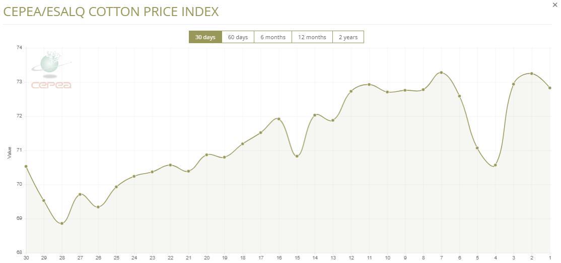 2025年3月7日,巴西CEPEA/ESALQ棉花價(jià)格指數(shù)報(bào)73.03美分/磅,較前一交易日下滑0.57%,止住此前連續(xù)兩日的升勢(shì),但該指數(shù)較上月同期增長3.21%。