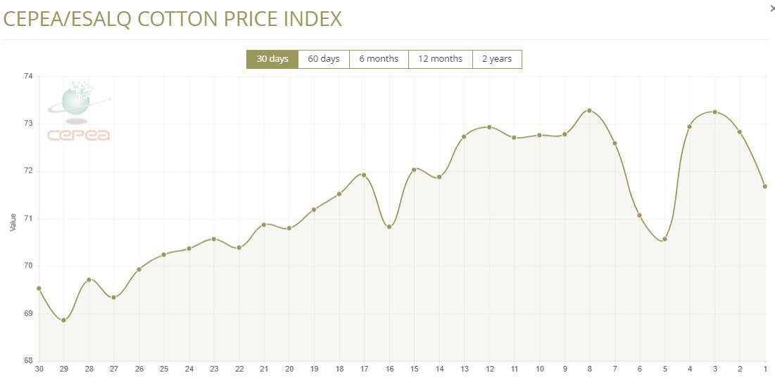 2025年3月10日,巴西CEPEA/ESALQ棉花價格指數(shù)報71.68美分/磅,較前一交易日下滑1.58%,為連續(xù)第二日下滑。該指數(shù)較前月同期增長1.57%。