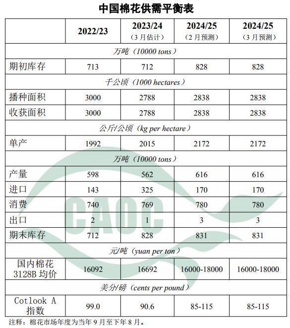 本月對2024/25年度中國棉花供需形勢預測不做調整。國內市場,棉花商業(yè)庫存仍處近5年同期最高位,供給較充裕。春節(jié)后紡織廠陸續(xù)復工,開機率逐步升至高位,紡織成品出庫有所加快。國際市場,美國、巴西棉花出口較上年同期增加,紡織業(yè)市場前景謹慎樂觀。北半球新棉即將進入播種期,后期需關注各主產國播種情況。