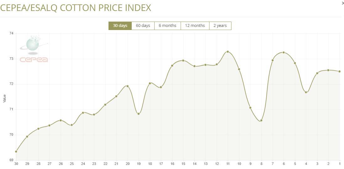 2025年3月13日,巴西CEPEA/ESALQ棉花價格指數(shù)報72.50美分/磅,較前一交易日下滑0.07%,該指數(shù)較前月同期增長2.73%。
