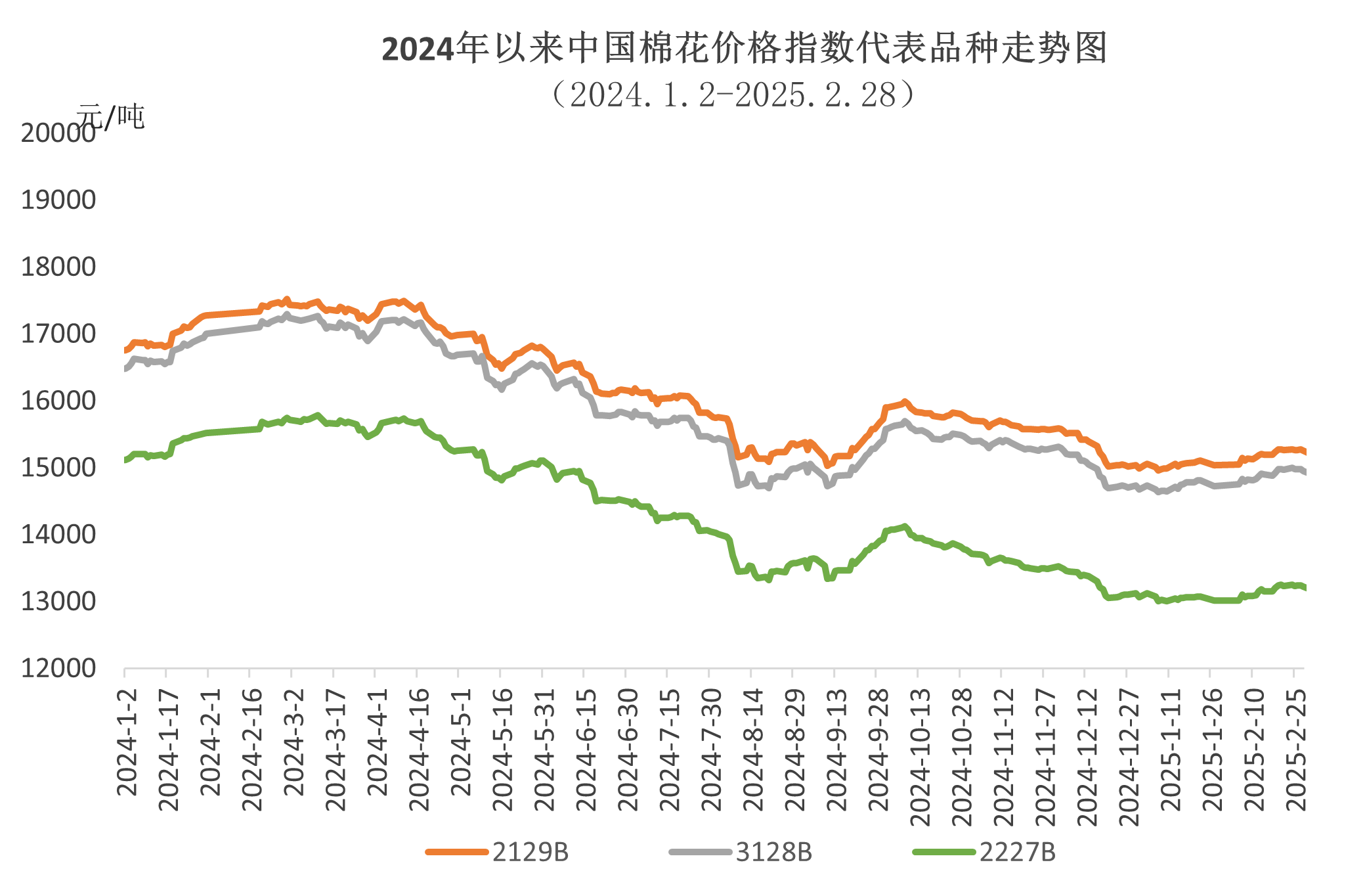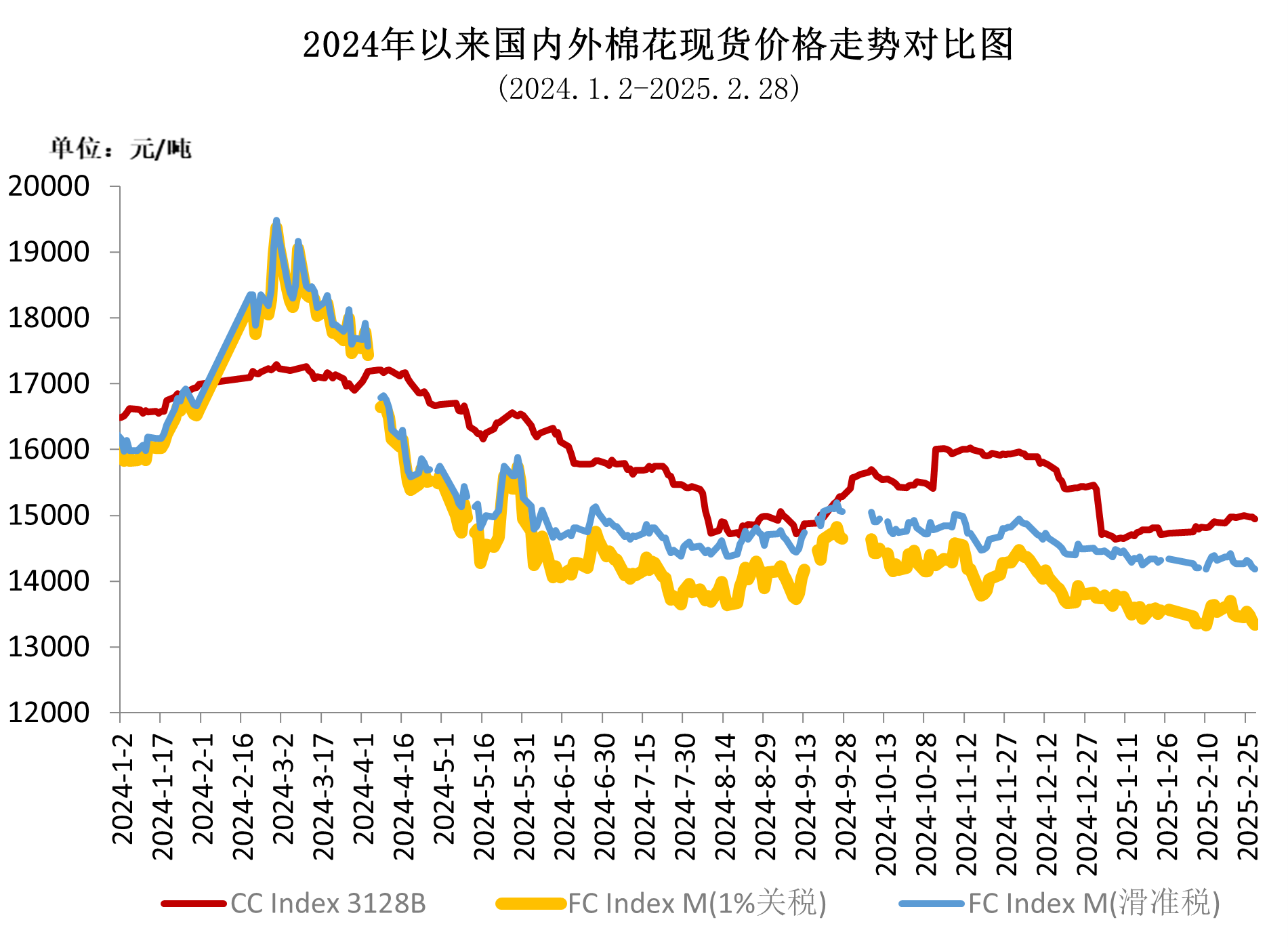2月,受益于宏觀政策利好和旺季預(yù)期,國內(nèi)棉價穩(wěn)中有升,中國棉花價格指數(shù)(CCIndex3128B)價格攀升至接近15000元/噸。月末受美國對中國額外加征關(guān)稅等不利消息影響,中國棉花價格指數(shù)有所回落。2月中國棉花價格指數(shù)(CCIndex3128B)月均價14899元/噸,環(huán)比上漲178元,同比下跌2208元。