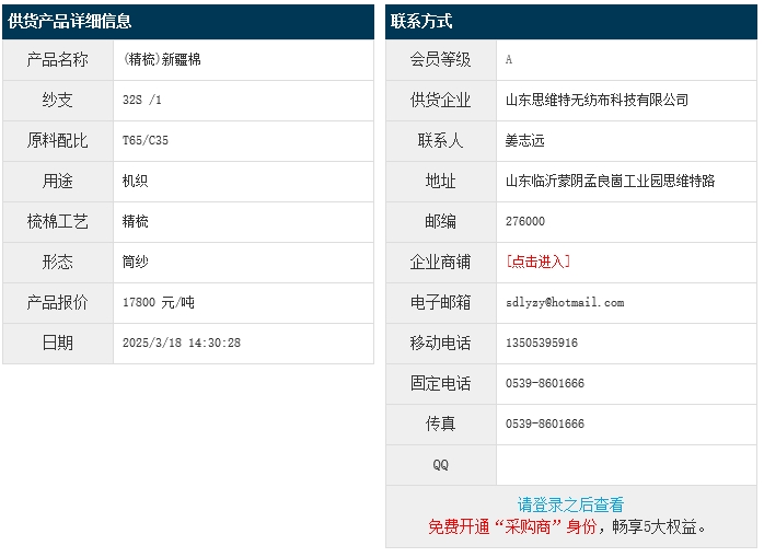 3月18日,山東思維特?zé)o紡布科技有限公司機(jī)織新疆棉滌棉紗T65/JC35 32S,報(bào)價(jià)為17800元/噸,實(shí)際成交價(jià)以協(xié)商為準(zhǔn)。[點(diǎn)擊查看詳情]