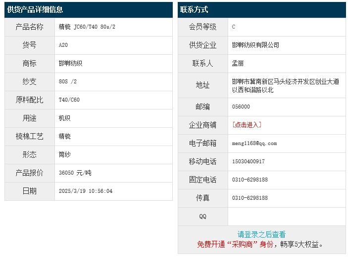 3月19日,邯鄲紡織有限公司機(jī)織滌棉紗JCVC60/40 80S/2,報(bào)價(jià)為36050元/噸,實(shí)際成交價(jià)以協(xié)商為準(zhǔn)。[點(diǎn)擊查看詳情]