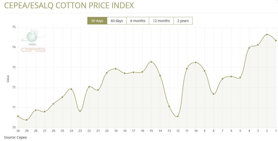 2025年3月19日,巴西CEPEA/ESALQ棉花價(jià)格指數(shù)報(bào)74.34美分/磅,較前一交易日下滑0.40%,該指數(shù)較前月同期增長(zhǎng)5.34%。