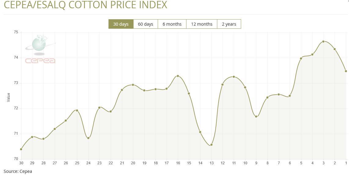 2025年3月20日,巴西CEPEA/ESALQ棉花價格指數(shù)報73.47美分/磅,較前一交易日下滑1.17%,該指數(shù)較前月同期增長4.11%。