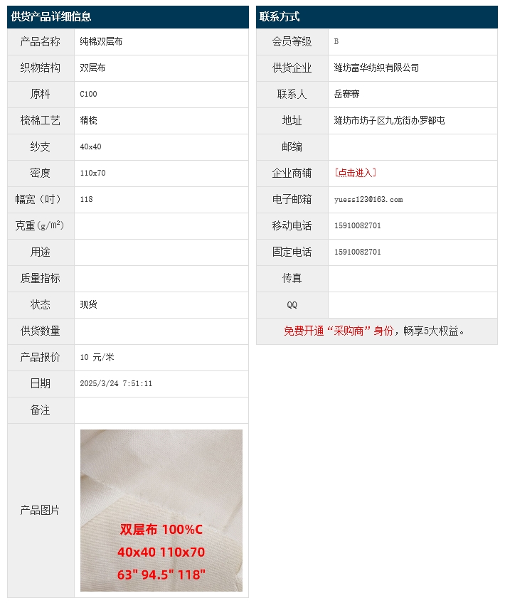 3月24日,濰坊富華紡織有限公司純棉雙層布JC100 40x40 110x70 118",報價為10元/米,實(shí)際成交價以協(xié)商為準(zhǔn)。[點(diǎn)擊查看詳情]
