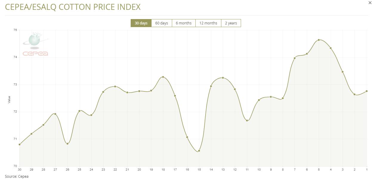 2025年3月24日,巴西CEPEA/ESALQ棉花價格指數(shù)報72.76美分/磅,較前一交易日上漲0.17%,該指數(shù)較前月同期增長3.1%。