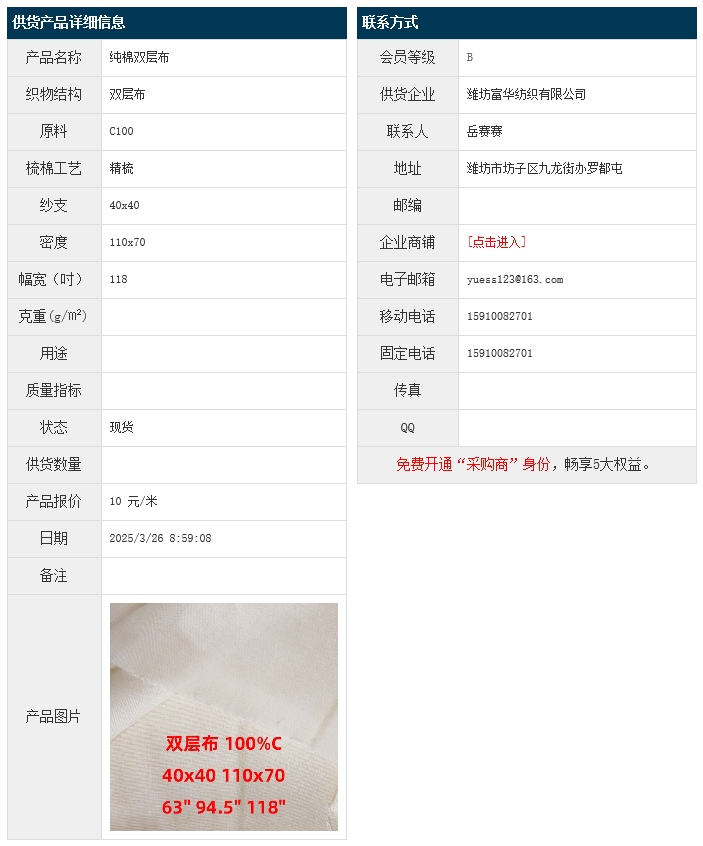 3月26日,濰坊富華紡織有限公司純棉雙層布JC100 40x40 110x70 118",報(bào)價(jià)為10元/米,實(shí)際成交價(jià)以協(xié)商為準(zhǔn)。[點(diǎn)擊查看詳情]