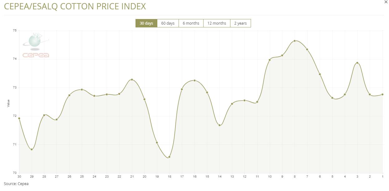 3月27日(周四),巴西CEPEA/ESALQ棉花價(jià)格指數(shù)報(bào)72.76美分/磅,較前一交易日持平,該指數(shù)較前月同期增長3.1%。