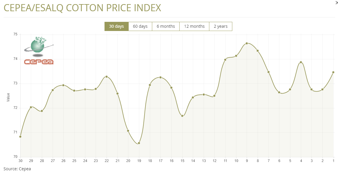 3月28日(周五),巴西CEPEA/ESALQ棉花價(jià)格指數(shù)報(bào)73.46美分/磅,較前一交易日上漲0.96%,該指數(shù)較前月同期增長4.1%。