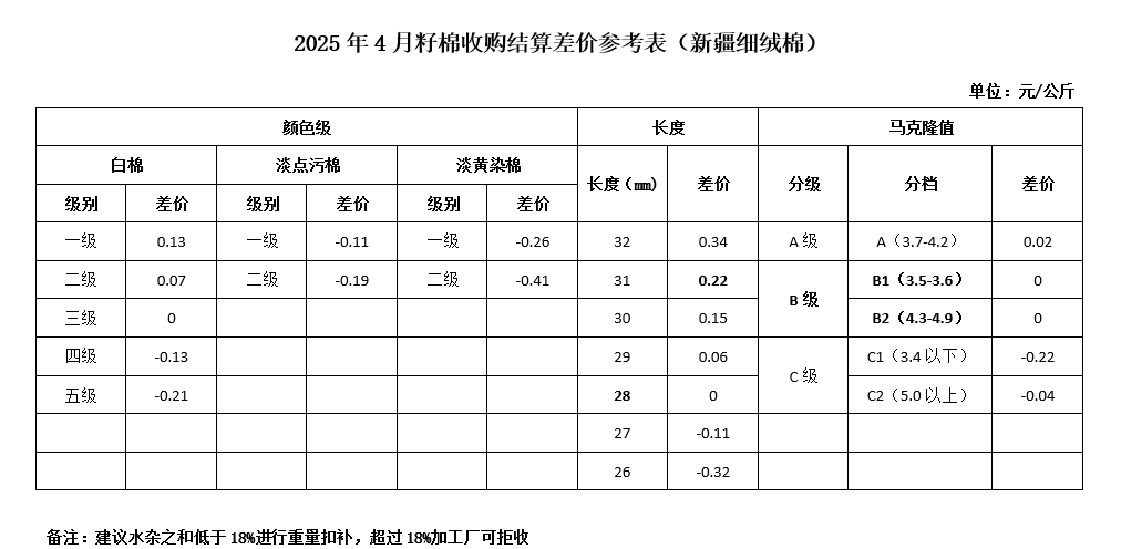 依據(jù)中國(guó)棉花協(xié)會(huì)發(fā)布的2025年4月《鋸齒加工細(xì)絨棉質(zhì)量差價(jià)表》和2024年9月-2025年2月新疆籽棉平均衣分率,折算得出籽棉收購差價(jià),與上月相比,差價(jià)保持不變。