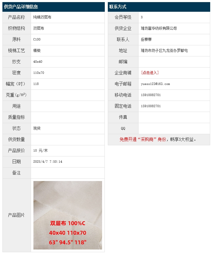4月7日,濰坊富華紡織有限公司純棉雙層布JC100 40x40 110x70 118",報價為10元/米,實際成交價以協(xié)商為準(zhǔn)。[點(diǎn)擊查看詳情]