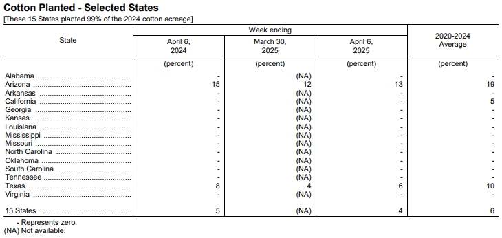 據(jù)美國農(nóng)業(yè)部網(wǎng)站消息,美國農(nóng)業(yè)部(USDA)在每周作物生長報告中公布稱,截至4月6日當(dāng)周,美棉種植率為4%,去年同期為5%,五年均值為6%。
