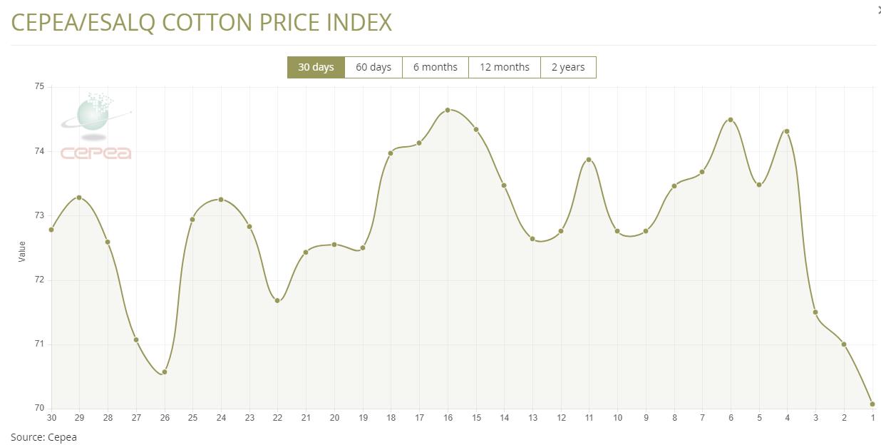 4月8日(周二),巴西CEPEA/ESALQ棉花價格指數(shù)報70.07美分/磅,較前一交易日下跌1.31%,該指數(shù)較前月同期下跌4.90%。