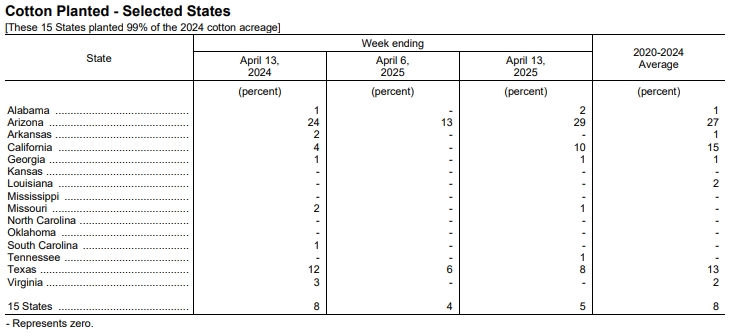 據(jù)美國(guó)農(nóng)業(yè)部網(wǎng)站消息,美國(guó)農(nóng)業(yè)部(USDA)在每周作物生長(zhǎng)報(bào)告中公布稱,截至2025年4月13日當(dāng)周,美棉種植率為5%,前周為4%,去年同期為8%,五年均值為8%。