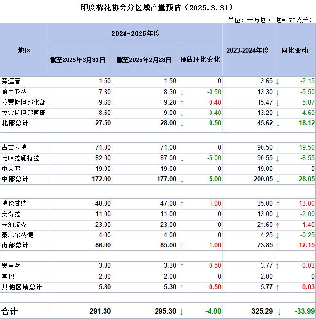 截至2025年3月31日,印度棉花協(xié)會(CAI)預(yù)計2024/25年度印度棉花產(chǎn)量為2913萬包,較2月預(yù)估值2953萬噸下調(diào)40萬包。最新產(chǎn)量預(yù)估較2023/24年度的3252.9萬噸低339.9萬噸,若預(yù)測準確,降幅為10.4%。